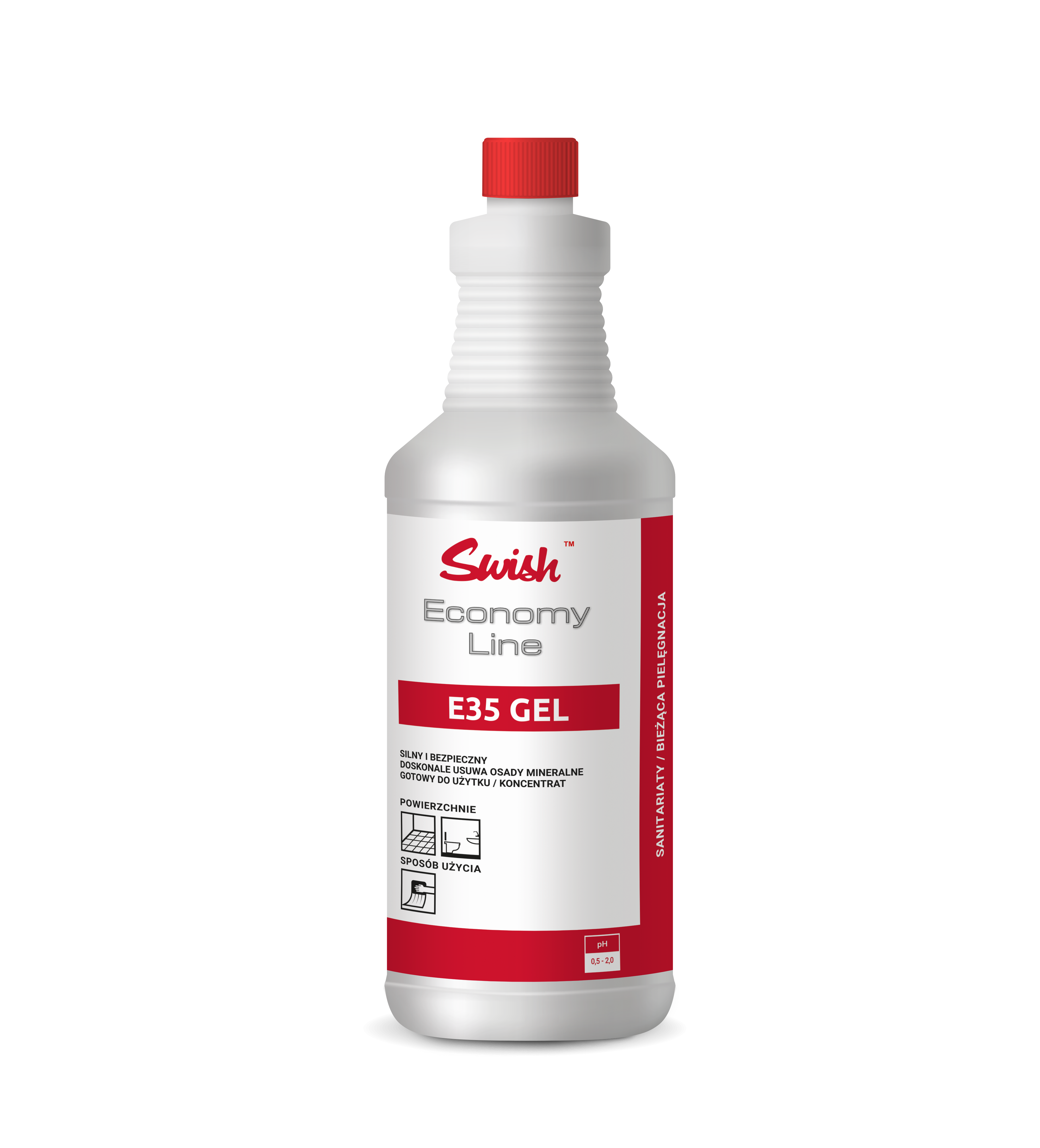 Preparat E35 GEL to innowacyjny produkt, któremu z trudem dorównują inne. Doskonale radzi sobie z usuwaniem osadów z kamienia i mydła, które pozostają oporne na szorowanie tradycyjnymi środkami do czyszczenia. Ponadto bardzo dobrze usuwa rdzawe naloty i inne typowe zanieczyszczenia, które często występują w sanitariatach. E35 GEL szczególnie polecany jest do czyszczenia armatury łazienkowej: wanien, umywalek, muszli klozetowych, kabin prysznicowych, płytek ściennych i podłogowych, i innych podobnych powierzchni.