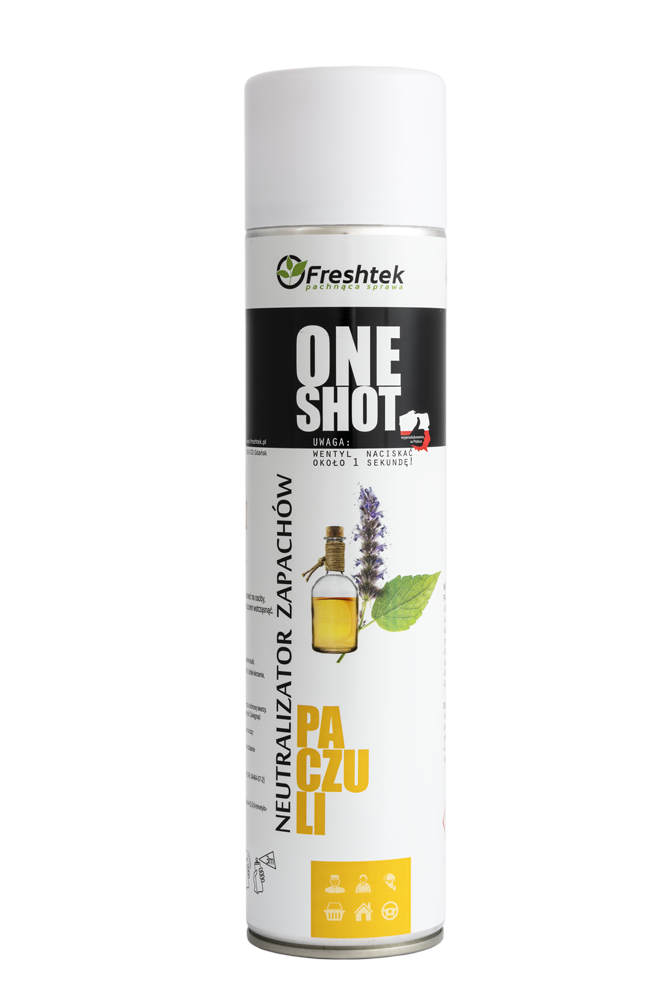 “One Shot” Paczuli marki Freshtek, o zapachu paczuli, to środek o podwójnym działaniu – odświeżacza powietrza i neutralizatora nieprzyjemnych zapachów. Zapach orienatlany, głęboki, korzenno-balsamiczny. Określenie “One Shot” oznacza, iż wystarczy jedno przyciśnięcie „spustu”, aby świeży zapach rozszedł się po całym pomieszczeniu. Jest to silnie skoncentrowany aerozol, więc znakomicie nadaje się wszędzie tam, gdzie mamy do czynienia z większą powierzchnią użytkową.