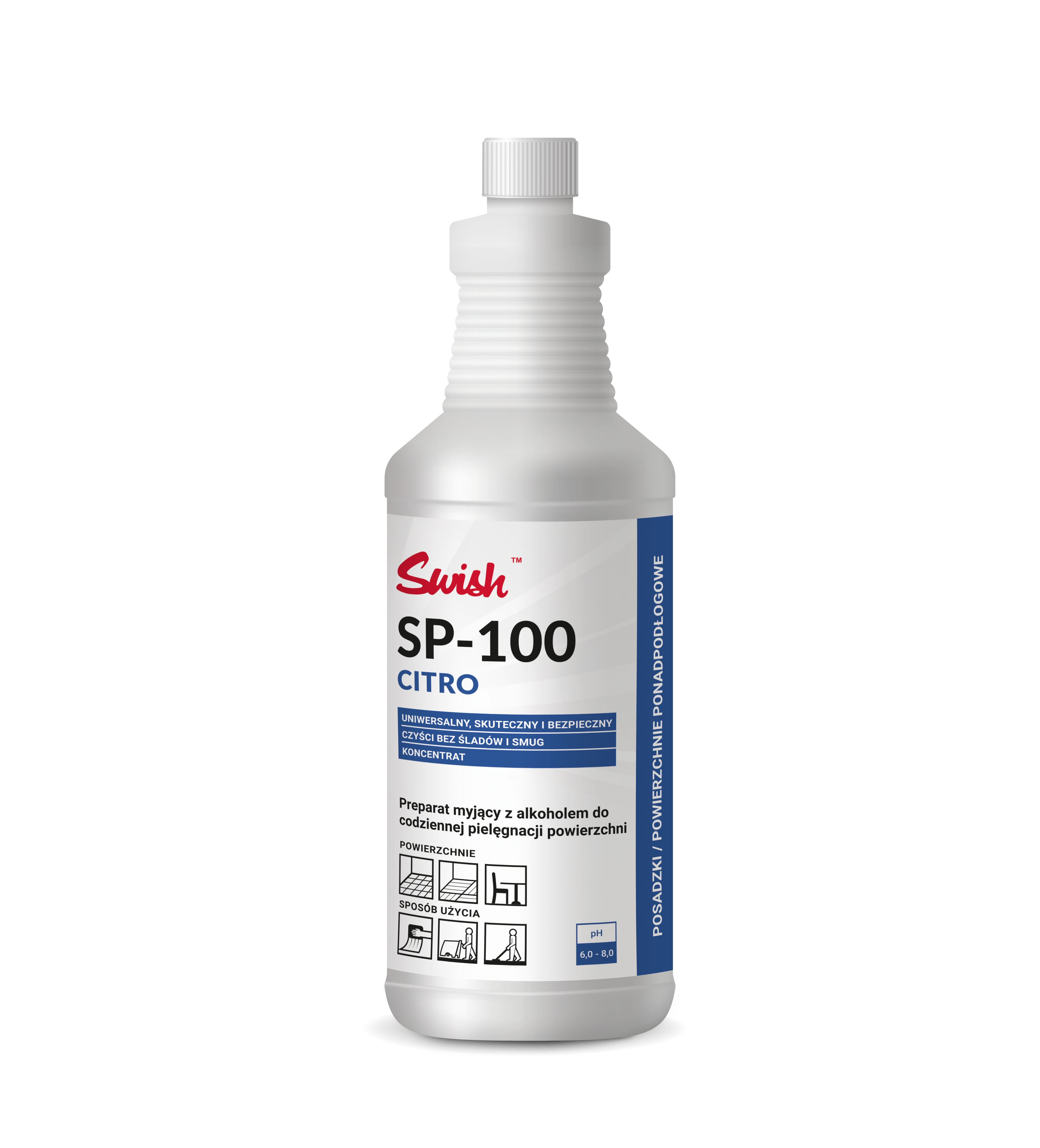 Preparat SP-100 CITRO to preparat o innowacyjnej formule. Środek zawiera w sobie alkohol i wykorzystywany jest do czyszczenia każdej powierzchni, która wykazuje odporność na działanie wody. Doskonale sprawdza się m.in. w myciu posadzek.