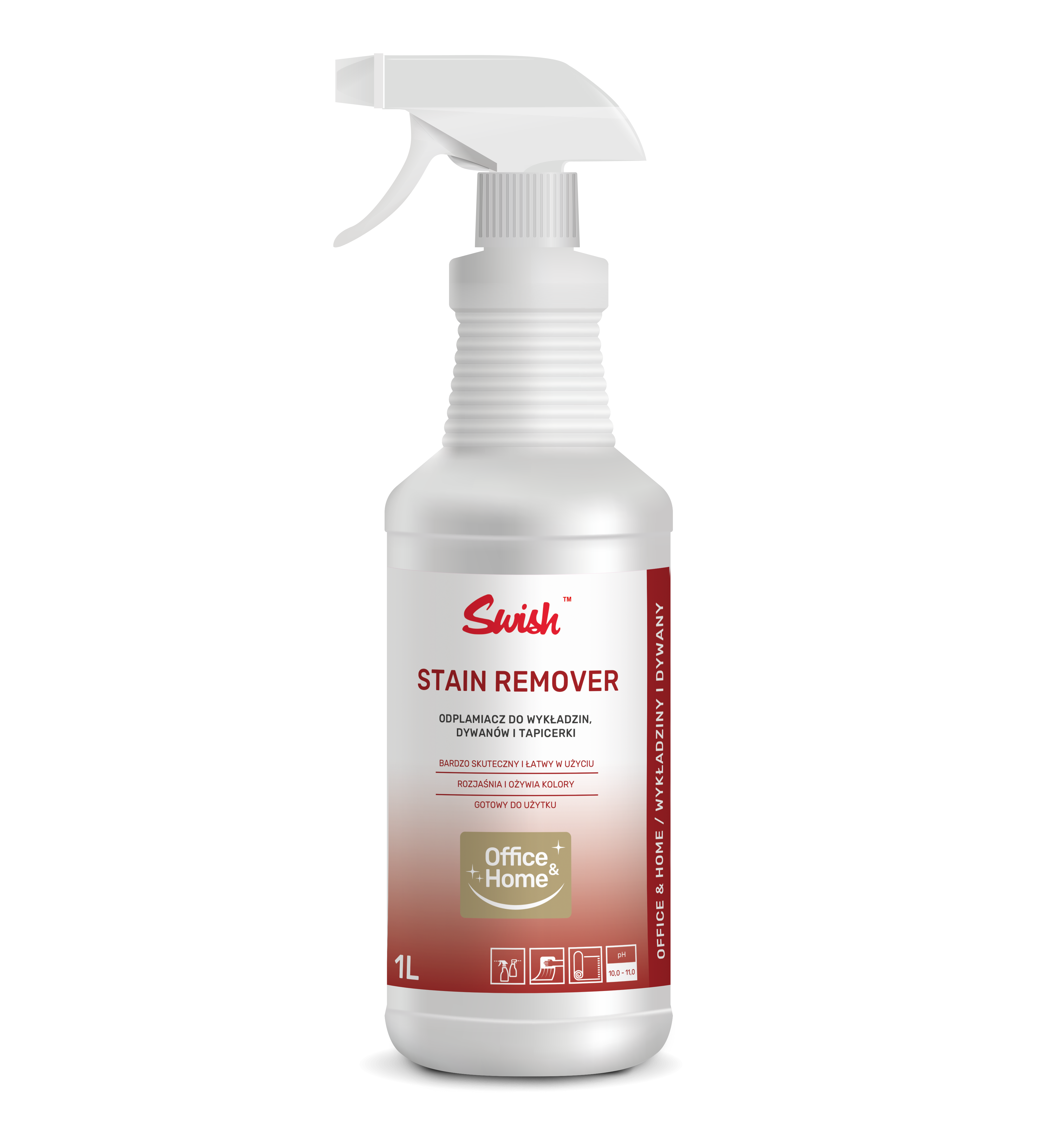 Stain Remover marki Swish to produkt niezbędny w walce z uporczywymi zabrudzeniami i plamami. Środek zawiera substancje zmiękczające wodę oraz rozpuszczalniki dzięki czemu skutecznie usuwa plamy i inne zabrudzenia z powierzchni materiałowych, a użyta kompozycja zapachowa Aromx pozwala na pozbycie się przykrego zapachu z czyszczonych powierzchni. Zawarte w płynie rozjaśniacze wywabiają zabrudzenia, jednocześnie ożywiając kolor i przywracając tkaninie pierwotne, żywe kolory. Oprócz tradycyjnego, punktowego odplamiania, zaleca się stosowanie Stain Remover jako przygotowanie (pre-spray) do mycia ekstrakcyjnego, w celu usunięcia trudniejszych zabrudzeń.